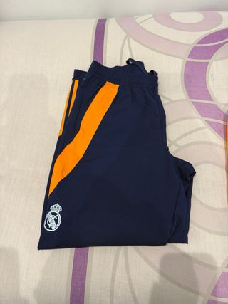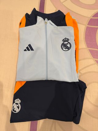 Conjunto de chándal del Real Madrid temporada 24/25. - Diseño con paneles en azul y naranja. - Logo de Adidas en la chaqueta. - Escudo del Real Madrid bordado en la chaqueta y pantalón.