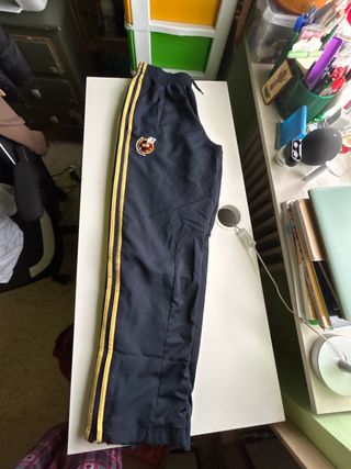 Pantalón deportivo Adidas con detalles dorados. - Logo de Adidas en la pierna derecha. - Inscripción 'RM' en la pierna izquierda. - Tres rayas doradas a lo largo de las piernas.