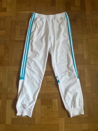 Pantalón deportivo del Real Madrid con detalles en turquesa. Tiene opertura en los bajos como se ve en la segunda foto. Marca Adiddas. Precio original: 80€. Puedo negociar el precio pero no mucho ya que esta en perfecto estado y es original de la tienda. Tengo la chaqueta a conjunto, el pack de los dos artículos se puede negociar tambien. - Diseño con las icónicas tres rayas de Adidas en los laterales. - Escudo del Real Madrid y logo de Adidas. - Cintura con cordón ajustable para mayor comodidad.
