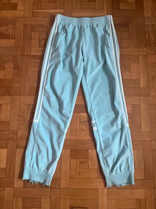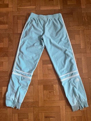 Pantalones deportivos Adidas con un diseño moderno y detalles llamativos. Talla 152, es como una XS Comprobar medidas en las últimas fotos - Rayas laterales blancas y turquesas. - Logo de Adidas en turquesa. - Cremalleras en los tobillos. - Bolsillos con cremallera.