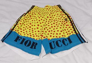 Pantalón corto deportivo con un diseño llamativo y divertido. - Estampado de puntos rojos sobre fondo amarillo. - Banda lateral con tres rayas. - Detalle de texto en la parte inferior.