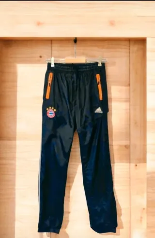 Pantalón de chándal del FC Bayern Munich con detalles naranjas. - Logo del FC Bayern Munich. - Logo de Adidas. - Cremalleras naranjas en los bolsillos.