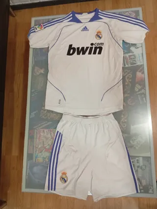 Conjunto deportivo del Real Madrid. - Camiseta blanca con detalles azules. - Pantalón corto blanco con detalles azules.