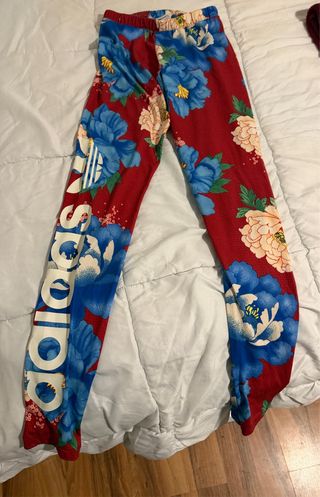 Leggings de Adidas con un llamativo estampado floral sobre fondo rojo. El diseño incluye grandes flores en tonos azules y blancos, con detalles en verde y pequeños toques rosados. - Diseño floral grande y vibrante. - Logo de Adidas en la pierna izquierda.