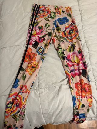 Leggings de Adidas con un vibrante estampado floral sobre fondo rosa. - Diseño con las tres rayas clásicas de Adidas en los laterales. - Cintura elástica para mayor comodidad. - Tejido suave y flexible.