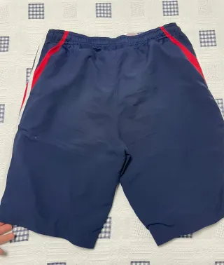 Pantalones cortos deportivos de la marca Adidas. - Diseño con tres rayas laterales. - Combinación de colores azul y rojo.
