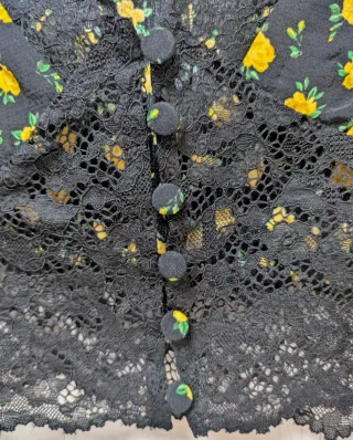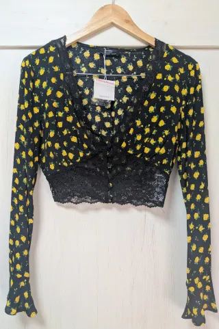 Blusa nueva con etiqueta de la marca Bershka, en color negro con flores amarillas. Diseño moderno y femenino, con detalle de encaje negro, botones frontales y mangas largas ligeramente acampanadas. Corte cropped, ideal para combinar con vaqueros, faldas o pantalones altos. Una prenda versátil y con mucho estilo, perfecta para looks casuales o más arreglados. ¡Lista para estrenar! 🌼 #bershka #blusa #floral #modafemenina #lookprimaveral #romántico #nuevaconetiqueta #modamujer #outfit #vintedfinds #ropabonita #trendstyle