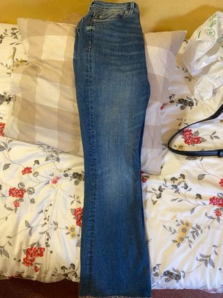 TALLA 38 SE AJUSTAN SON PATA CASI PITILLOS ME QUEDAN PEQUEÑOS POR ESO LOS VENDO NO SON MUY ALTOS DE CINTURA .TRASERA BORDADA
