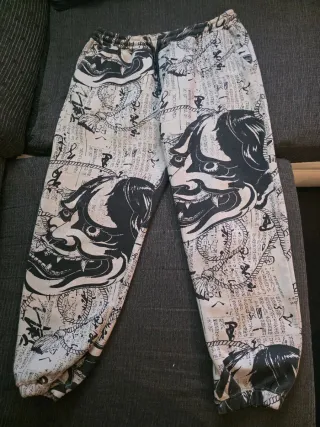 Pantalones con un diseño llamativo y original. - Estampado integral de máscaras y escritura. - Cintura elástica con cordón. - Puños ajustados en los tobillos.