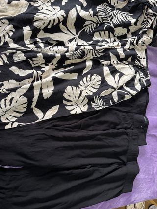 Pantalón ligero con estampado tropical de flores y hojas verdes sobre fondo negro. Ideal para días cálidos. - Diseño de cintura elástica. - Piernas anchas y fluidas. - Estampado vibrante de hibiscos y hojas de plátano.