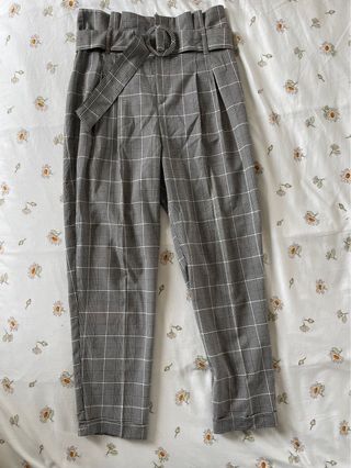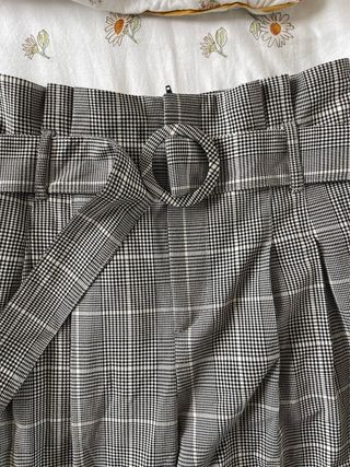 Pantalones de Bershka con un diseño a cuadros moderno y cintura alta. - Estampado de cuadros en gris, blanco y negro - Cintura con cinturón anudado. - Pierna ancha y recta. - Talla M