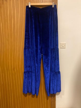 Pantalón de plush de color azul. - Tejido suave y brillante. - Diseño de pierna ancha. - Detalle de volantes en los bajos. - Sin uso.