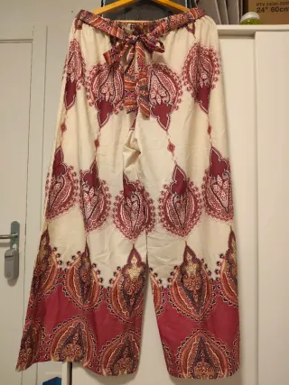 Pantalón ancho aurora pronto moda italiana talla m pero la parte de detrás es de goma q da mucho por lo q puede ser para más talla largo un metro como nuevo