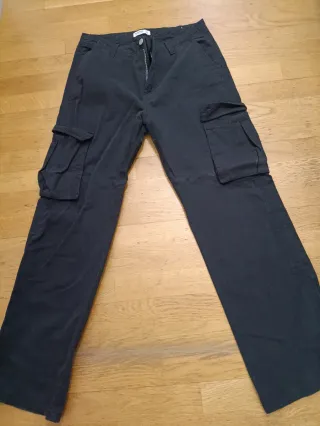 Pantalones cargo de Zara en color verde. Diseño moderno y funcional. - Bolsillos cargo en los laterales. - Cintura con trabillas para cinturón. - Cierre de cremallera y botón.