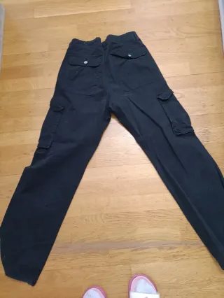 Pantalones anchos de color negro con múltiples bolsillos. - Diseño de carga. - Cierre de botón y cremallera. - Dos bolsillos laterales. - Dos bolsillos cargo en las perneras. - Dos bolsillos traseros.