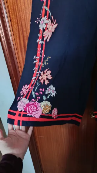 Pone 13-14, pero yo tengo la 34-36 y me quedan bien. Pantalón largo con un bonito estampado floral. - Diseño de flores y hojas. - Piernas anchas y fluidas.