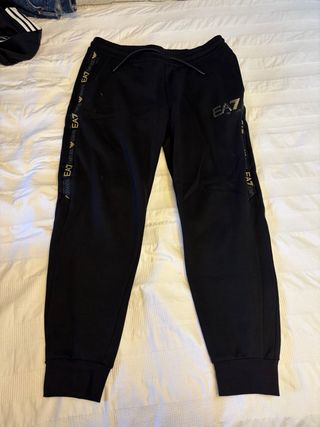 Pantalones deportivos Emporio Armani para hombre. Son de color negro y lucen impecables. - Diseño elegante y deportivo. - Detalles laterales con el logo EA7. - Cintura elástica con cordón ajustable. - Puños de canalé en los tobillos.