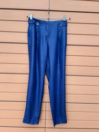 Pantalones rectos Armani de color azul, talla 46 aunque puede valer para una 44. Son elegantes y de un tejido suave. - Corte recto - Cierre con cremallera y botón - Bolsillos delanteros y traseros