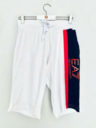 Pantalones cortos Emporio Armani, talla L. Son de color blanco y rojo, y presentan un diseño impecable. - Diseño deportivo con banda lateral. - Cierre con cordón. - Tejido suave y cómodo.