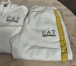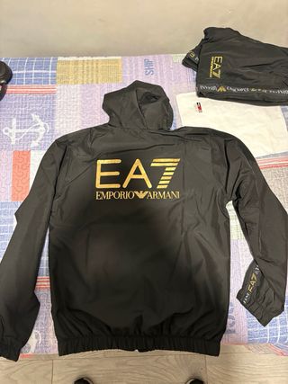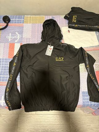 Conjunto deportivo de la marca Emporio Armani EA7 NUEVO Y CON ETIQUETAS. Presenta un diseño moderno y detalles distintivos. - Chaqueta con capucha y cremallera completa. - Pantalón a juego. - Logos de la marca en mangas y pecho. - Tejido ligero y cómodo.