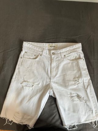 Conjunto de tres pantalones cortos. - Un pantalón cargo con estampado de camuflaje. - Un pantalón vaquero de color azul claro con rotos. - Un pantalón vaquero blanco con rotos.