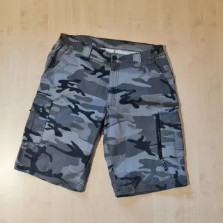Pantalón corto de camuflaje de la marca Quiksilver. - Diseño de camuflaje en tonos verdes y marrones. - Bolsillos cargo laterales. - Cierre de botón y cremallera.