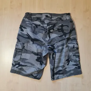 Pantalones cortos con estampado de camuflaje. 40cm cintura 57cm largo - Diseño de camuflaje en tonos grises y negros. - Cintura elástica lateral - Bolsillos cargo laterales. - Bolsillo con cremallera en el lateral. - son del Decathlon sección caza
