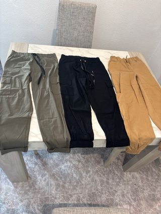 Conjunto de pantalones de diferentes estilos y colores. Hay uno que no sale en las fotos generales porque ha sido añadido después, son 10 en total. - Pantalón de cuadros blanco y negro. - Pantalón cargo color beige. - Pantalón negro. - Pantalón gris. - Pantalón vaquero azul claro. (x2) - Pantalón vaquero azul oscuro. - Pantalón de camuflaje. Marcas: Stradivarius, Bershka Todos por 25€