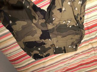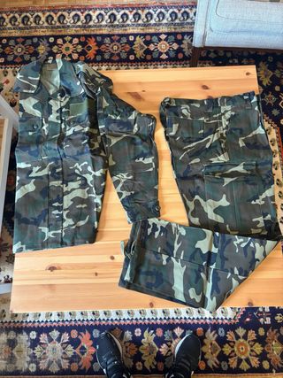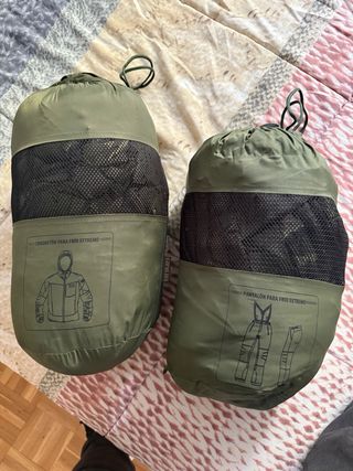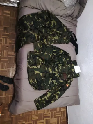 Conjunto de chaqueta y pantalón de agua con estampado de camuflaje. La marca ni la mire cuando lo vi no es esa, diseño de camuflaje verde y multicolor, traje de lluvia, de frío, traje de intemperie usando antiguamente por las fuerzas armadas en el ejercito de tierra, ideal para actividades al aire libre, recreaciones, airsoft incluso para la moto, es pequeño es talla 0 y está totalmente nuevo lo vendo porque no me queda.