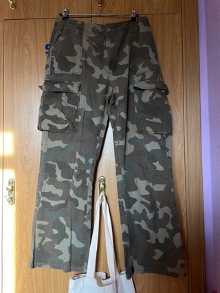 Pantalón cargo con estampado de camuflaje de la marca Bershka. - Diseño con múltiples bolsillos. - Cierre de botón y cremallera. - Trabillas para cinturón.