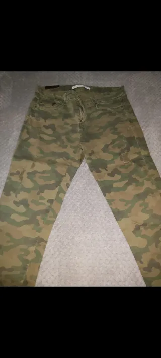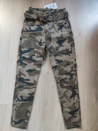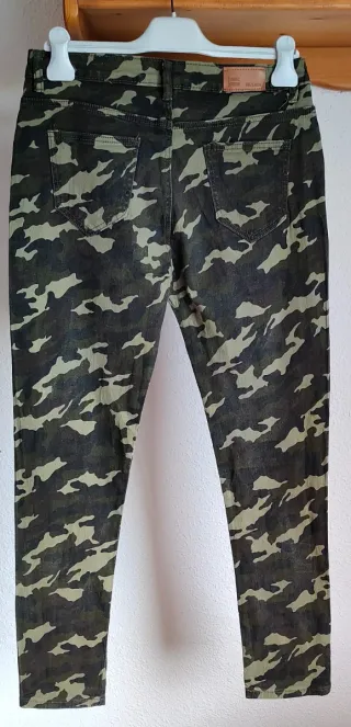 Pantalones con estampado que combina camuflaje y flores. Rayas laterales con lentejuelas. Cintura de goma con cordón para ajustar. Tienen vuelta en el bajo que se puede descoser, es sólo una puntada a cada lado. Diseño arrugado, aunque se podrían planchar. Tela de algodón parecido a vaquero. Miden 44 cm de cintura y 80 de largo. Poco uso.