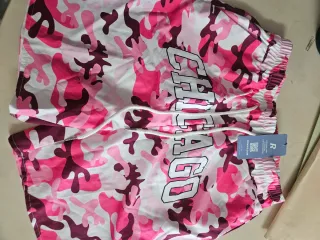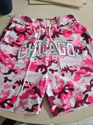 Pantalón corto con estampado de camuflaje en tonos rosas y blancos, con el texto CHICAGO en grande. - Cintura elástica con cordón. - Diseño llamativo. - Etiqueta de la marca incluida.