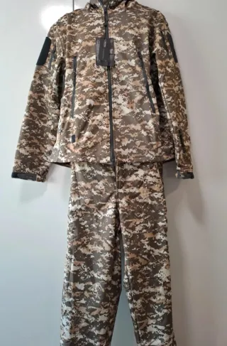 Conjunto táctico de camuflaje tipo softshell. Pantalon y chaqueta. 2XL nuevos. - Multibolsillos. - Chaqueta con capucha enrollable y cremallera frontal. Bolsillo lumbar. - Pantalones a juego. - Diseño de camuflaje pixelado en tonos tierra.
