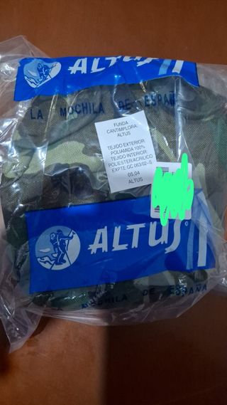 Funda para cantimplora de la marca Altus con diseño de camuflaje. 10€ chaqueton 30€ Traje interperie 30€ Conjunto chaqueta y pantalón 50€ Trinchas, neceser, etc 10€