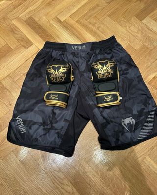 Conjunto de pantalón corto y guantillas de MMA de la marca Venum. - Pantalón corto con diseño de camuflaje. TALLA M - Guantillas con detalles dorados y diseño 'Unleash the Beast'. Talla L/XL