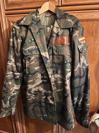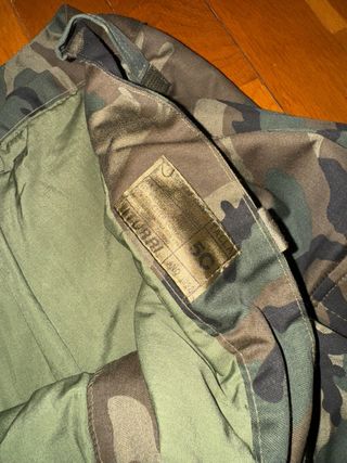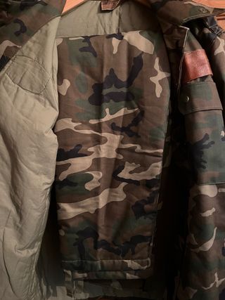 Chaquetón y pantalón militares de camuflaje. - Conjunto de dos piezas: chaqueta y pantalón. - Diseño de camuflaje boscoso Modelo antiguo. - Talla 2L. Está de paquete recien abierto y sin uso.