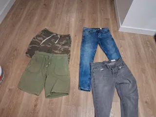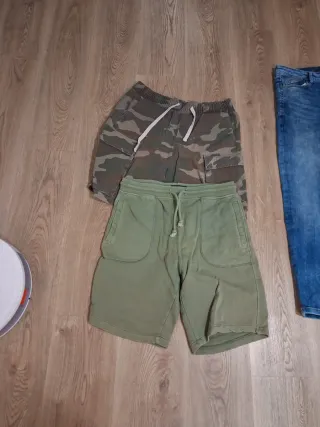 Ropa para hombre, ideal para un estilo casual. 24 prendas en total. - Pantalones vaqueros azules. - Pantalones vaqueros grises. - Bermudas verdes de tela. - Bermudas de camuflaje. - Camisetas y polos variados. Todo por 30 euros.