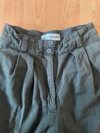 Pantalón de corte relajado con cinturilla elástica y cordón. Medidas: Cintura 40cm, cadera 58cm, Largo 108cm - Tejido de Algodón y lino. - Color kaki. - Talla M.