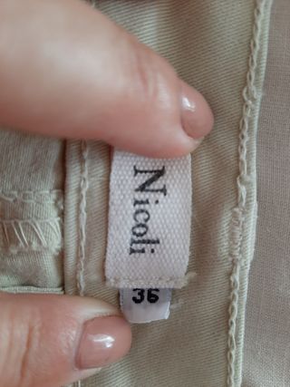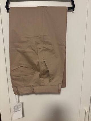 pantalones de lyocell de entretiempo color barquillo (más oscuro de lo que se ve en las fotos) que se van estrechando en tobillo y con botón en la parte trasera del bajo. Usados dos veces