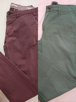 Pantalones chinos de la marca Sfera y Jules en un tono verde y berenjena. PERFECTO ESTADO - Diseño clásico. - Cierre de botón y cremallera. - Bolsillos delanteros y traseros. TAMBIÉN SE VENDEN INDIDUAL A 10€ CADA UNO