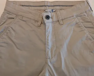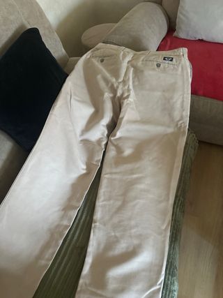 Pantalones tipo chinos sin pinzas para chico de la marca Lefties. Son de color beige y tienen corte recto. Una sola puesta!! - Talla: 40 - Material: 100% algodón - Bolsillos laterales y traseros cerrados con botón Contorno de cintura: 41cm y largo 102cm