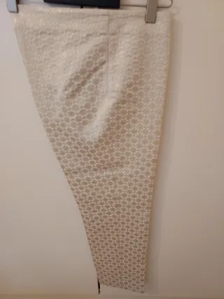 Elegantes pantalones de fiesta crop de Anmargo., cremallera delantera - Medidas cintura 44 cm , cadera 52 cm , largo 90 cm - Diseño crop , tiro medio - Tejido con estampado floral. - Acabado brillante.
