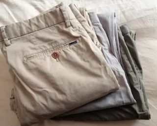 Vendo lote de pantalones Chinos, talla 42, en perfecto estado, casi sin uso. Se entrega en Guadalajara o en Madrid. Se puede consultar para realizar envío directamente desde Correos.