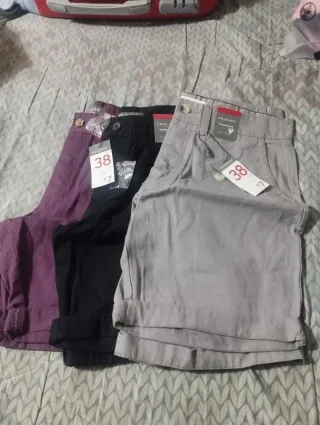 Lote de tres pantalones cortos tipo chino. - Tres colores disponibles: morado, negro y gris. - Talla M (equivalente a 38-40 / 48-50). - Cada pantalón tiene una etiqueta de precio.