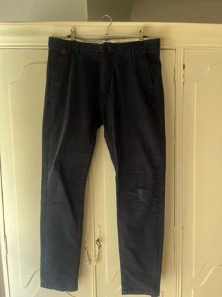 Pantalón tipo chino para hombre.Azul marino,talla 44,recto,2 bolsillos laterales, 2 bolsillos traseros simulados usados un par de veces, perfecto estado - Corte moderno. - Tejido algodon cómodo y resistente.