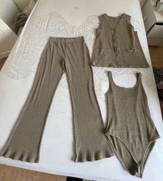 Conjunto de tres piezas de canalé. - Chaleco con botones y bolsillos. - Body de tirantes. - Pantalón acampanado con volantes en el bajo.