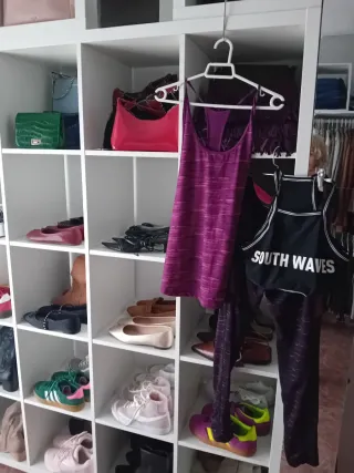 Prendas en talla XS. El lote incluye dos camisetas de manga larga, verde oliva y multicolor. Una camiseta de tirantes brillo dorado. Las prendas se encuentran en buen estado. Tambien hay una falda pantalón de verano y una minifalda para invierno