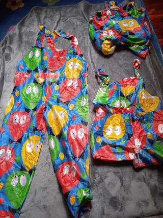 3 Disfraces de payaso con un estampado muy alegre y colorido. Ideal para fiestas o eventos. - Diseño con caras de payaso. - Tirantes ajustables. - Pantalón tipo mono.