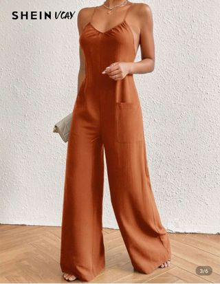 Preciosa mono de color marrón de la marca SHEIN. Es de tirantes y tiene un diseño elegante y cómodo. - Diseño de tirantes - Corte amplio de pierna - Cierre con lazo en la espalda - Bolsillos laterales
