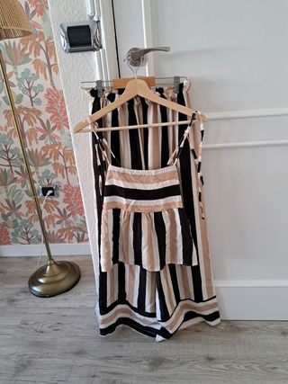 Conjunto de dos piezas para mujer, ideal para un look casual y veraniego. - Falda larga con cintura elástica. - Top corto con tirantes finos. - Diseño a rayas verticales en beige y negro. Descuentos por comprar varios productos de mi perfil.